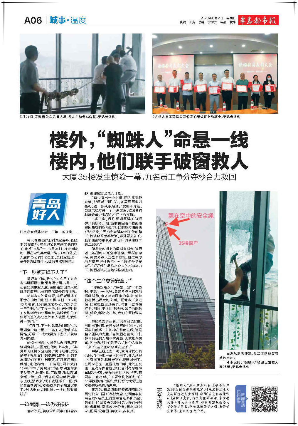 5月24日,一工人在青島某大廈高空作業時,被困于35樓窗外,安全繩緊緊勒住了他的脖子,隨時有窒息的可能。幸而樓內9位員工及時發現,緊急破窗救人,被救者目前已平安。