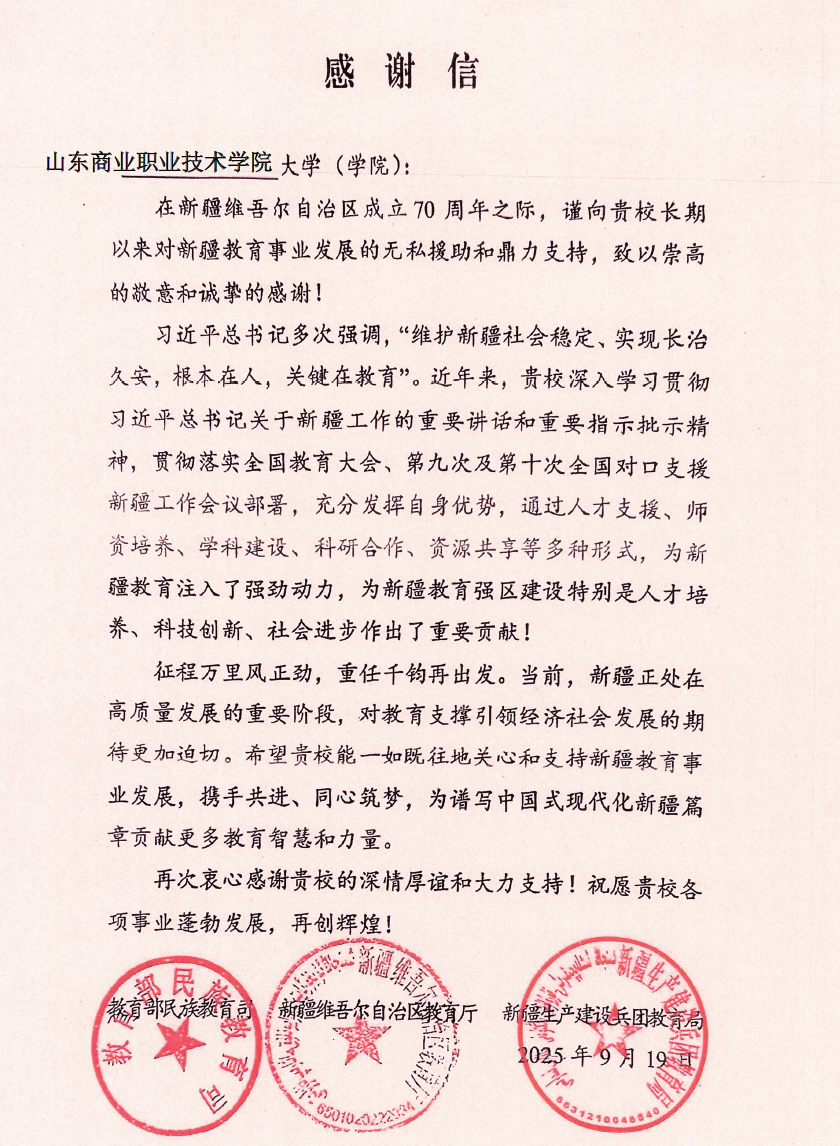 近日,教育部民族教育司、新疆維吾爾自治區教育廳與新疆生產建設兵團教育局聯合向山東商職學院發來感謝信,對山東商職學院“長期以來對新疆教育事業發展的無私援助和鼎力支持,致以崇高敬意與誠摯感謝”!