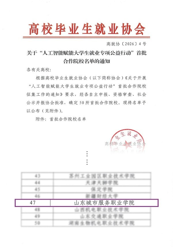 近日,高校畢業(yè)生就業(yè)協(xié)會正式公布“人工智能賦能大學生就業(yè)專項公益行動”首批合作院校名單,山東城市服務職院憑借扎實的就業(yè)工作基礎、創(chuàng)新的就業(yè)服務模式及顯著的就業(yè)工作成效,成功入選,成為全國首批、區(qū)域領先的獲選院校之一。